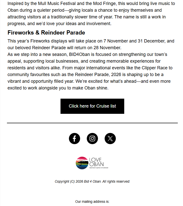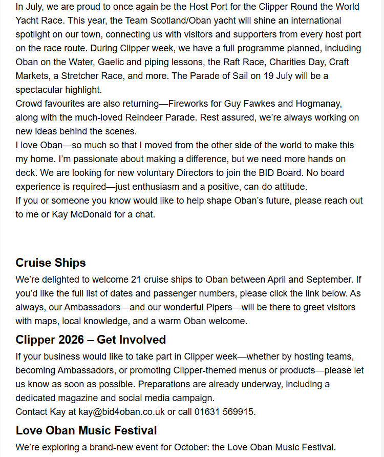 BID4Oban Newsletter for March 2026 Kay McDonaldApril 2, 2026 Facebook0 Twitter LinkedIn0 Reddit Tumblr Pinterest0 0 Likes